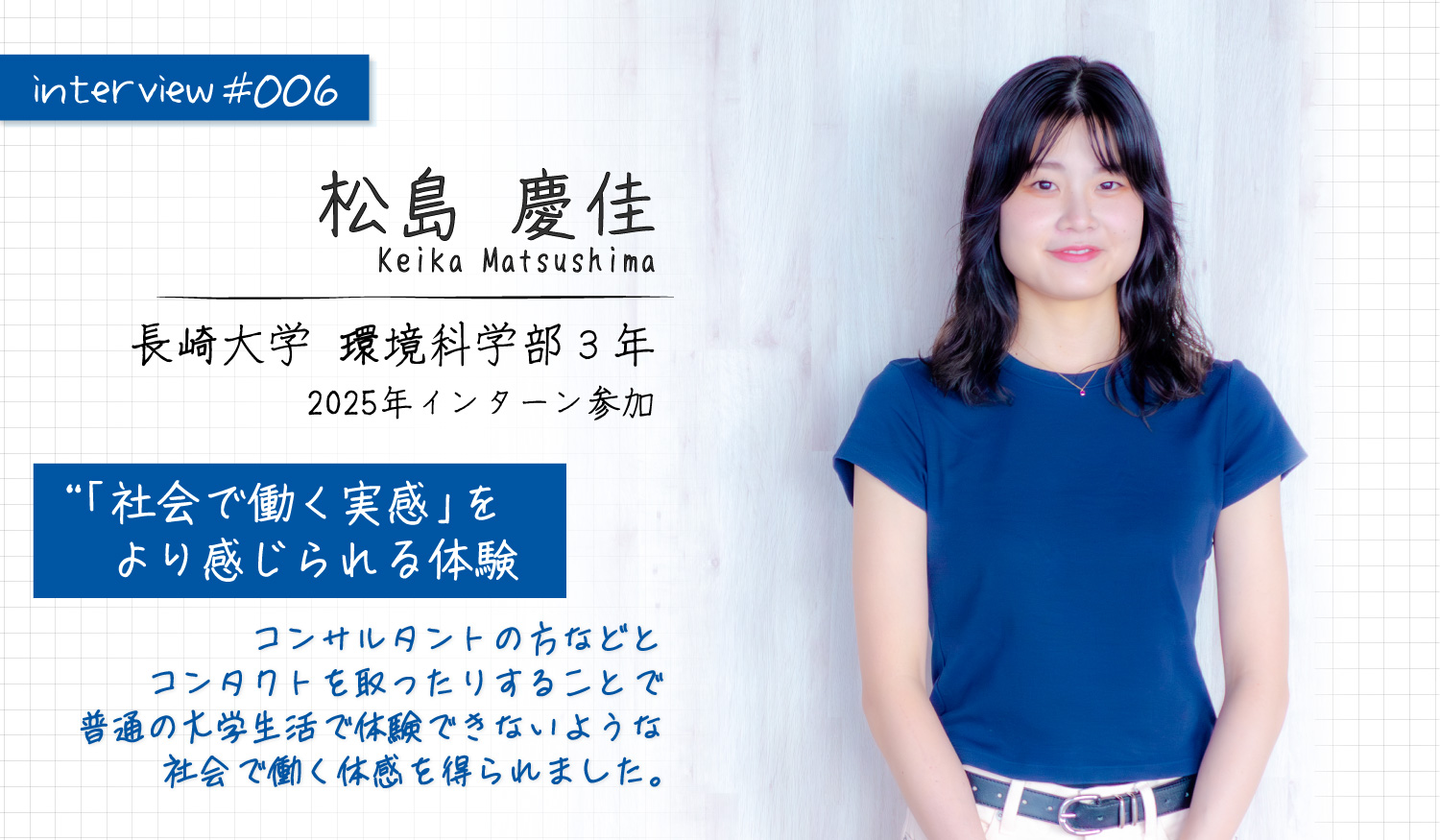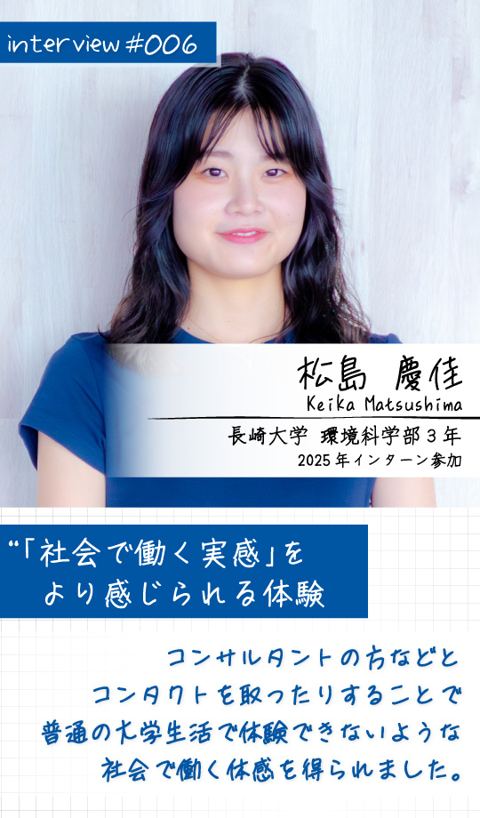 マーケティングとは実際にどんな業務なのかを学べることを楽しみにしていました。単純になにかしたい!という思いだけで応募したこともあり、会社で働くというイメージもわからず、不安もありましたが、社員の方が丁寧に方向性を示してくださり、その想いに共感できたことで、会社に貢献する自覚を持つことができました。